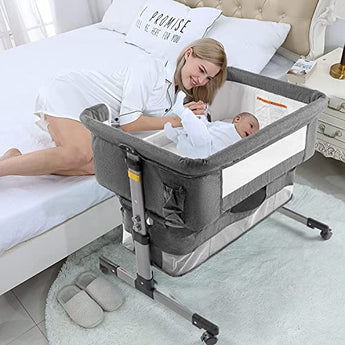Bring baby exactly where you want them—beside you, yet safely contained—with this 3-in-1 bedside crib. Designed for newborns and growing with your family, it doubles as a portable bassinet, a standalone crib, and a co-sleep companion that adapts to your bed. The grey finish and breathable mesh panels create a calm, comfortable sleep surface that prioritizes safety and convenience for busy parents.